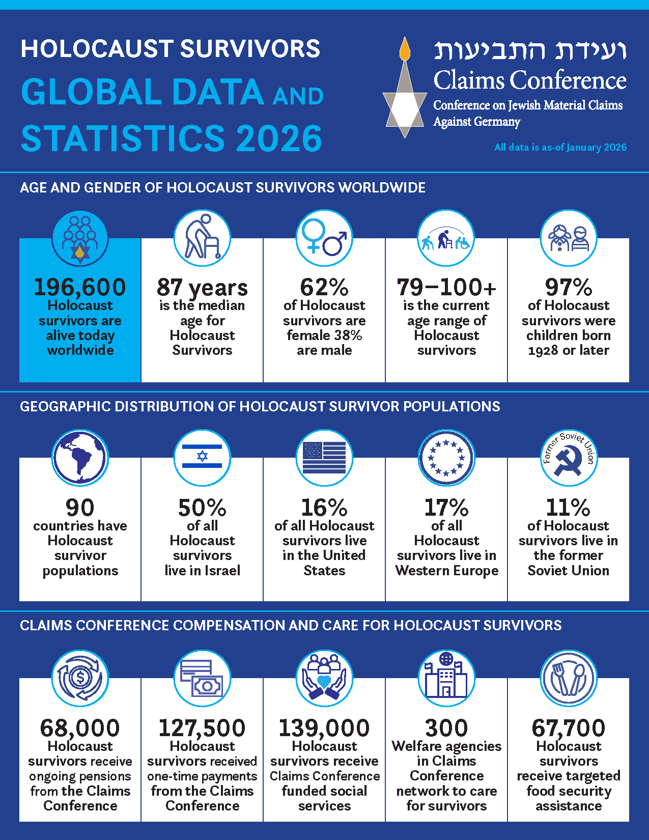 The data provides a clear, up-to-date snapshot of the global survivor population, including total numbers, gender demographics, geographic distribution and critical figures related to compensation and care. The data sheet is intended as a resource for journalists covering International Holocaust Remembrance Day and related stories, offering essential context on the aging survivor population and the ongoing need for support and remembrance.